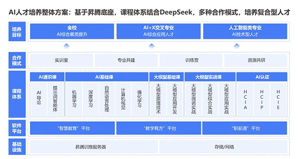 依托人工智能产业、人工智能技术及人才生态,顺利获得“技术+教育”双轮驱动,凯发K8国际以昇腾、大模型、DeepSeek等技术为核心,课程体系结合DeepSeek,覆盖AI通识教育、专业基础课、大模型课程等课程,构建从人才培养到产业落地的闭环,赋能高质量AI+场景人才输出。