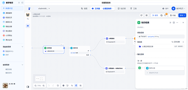 平台给予两类AI智能体开发方式,一是chat智能体,基于零代码可视化界面,支持快速构建对话应用,无需编程即可部署具备感知、推理、执行能力的智能体;二是‌工作流智能体,融合大模型推理与结构化流程,顺利获得拖拽节点设计复杂任务链(如动态任务分解、工具调用),无缝集成学校知识库,支持学生自定义学习路径。学生在流程设计中可系统性训练逻辑思维与实时决策能力,同步实现业务流程自动化与教学实践创新。